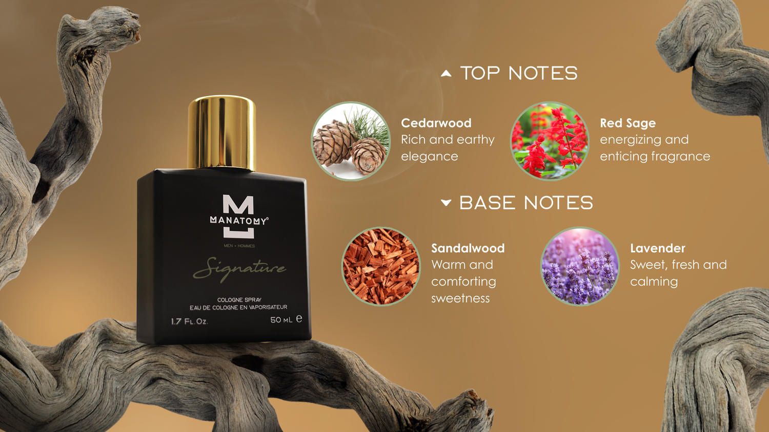 Manatomy Signature opens with cedarwood and red sage, warms into spices, and settles into a refined base of lavender and sandalwood. Nature in balance, confidence in a bottle.